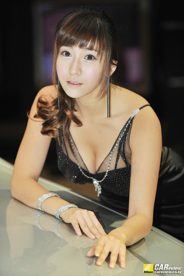 GM대우 베리타스 출시 기념 행사에서 GM대우 전속 레이싱 모델 구지성이 포즈를 취하고 있다.