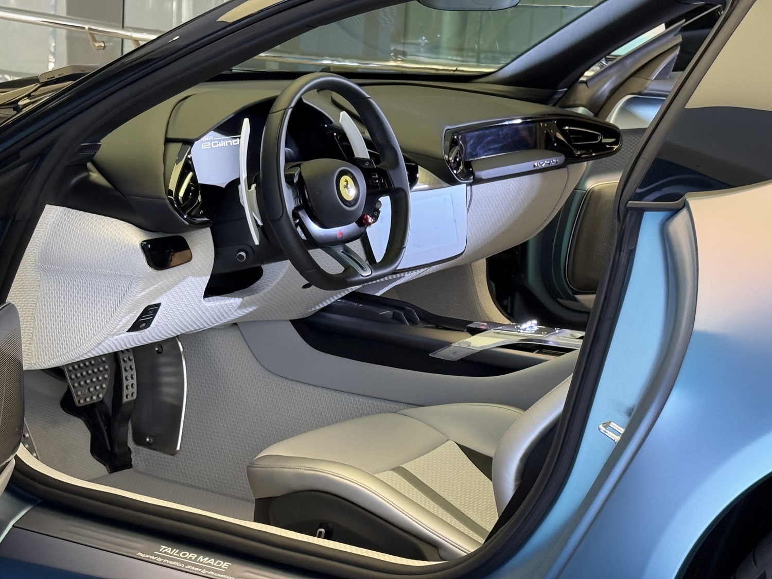정 작가의 작품 세계는 이 세상에 단 한대뿐인 테일러메이드 모델 곳곳에 다양한 방식으로 투영됐다. 먼저 시트와 바닥, 그리고 실내 소프트 소재에는 작가의 시그니처 패턴이 적용됐다. 이는 국내 기업이 개발한 신소재 3D 패브릭을 통해 생생하게 구현됐다. 페라리 차량에 이 소재가 채택된 것은 이번이 처음이다. 또한, 12칠린드리의 글라스 루프에도 해당 패턴을 스크린 프린팅 방식으로 새겨 넣어, 빛이 투과될 때 그림자와 빛이 빚어내는 고유의 아름다움을 즐길 수 있다. 이 역시 페라리 역사상 최초의 시도다.